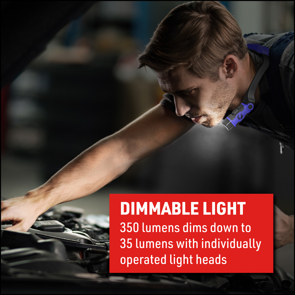 • Bright: 350 Lumens dims down to 35 lumens • Innovative: Durable ABS construction combined with ultra comfort neck band • Ergonomic: One size fits most • Pivoting: Adjustable light heads • Rechargeable: USB-C cord included